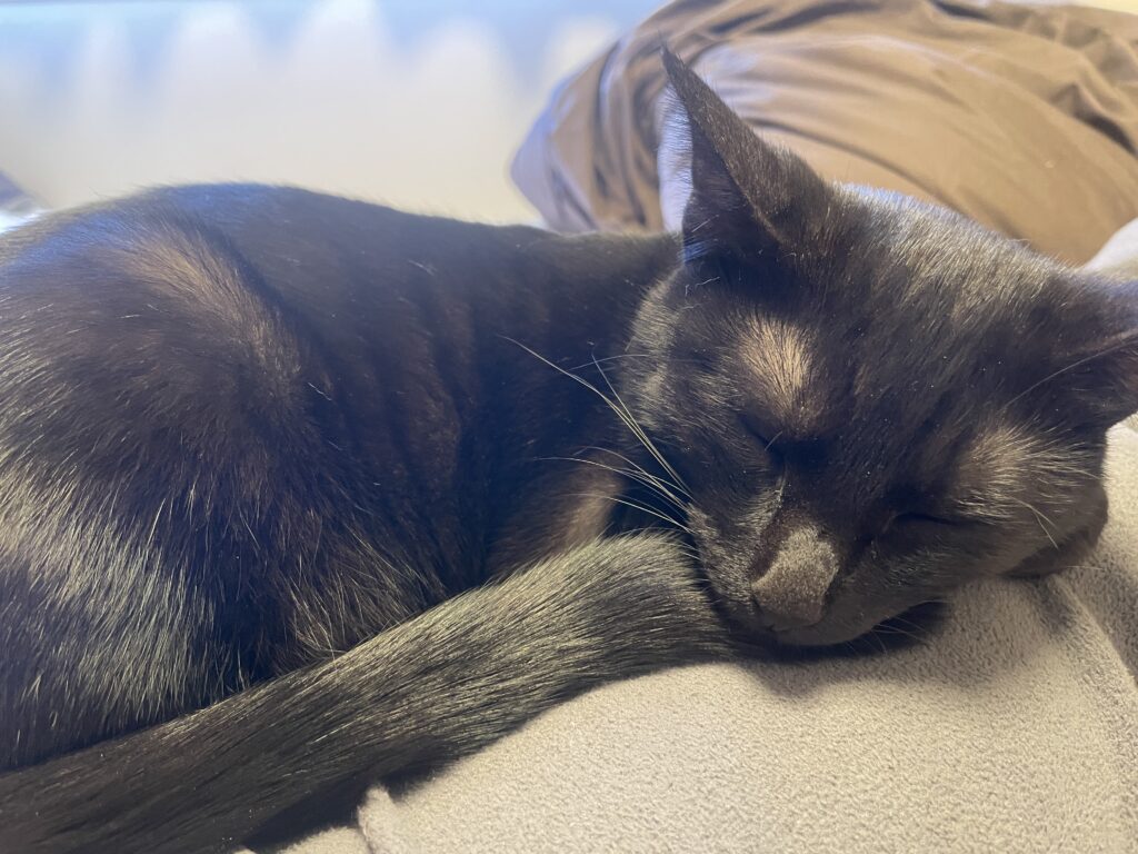 性格は引越しで環境が変わったからなのか、避妊手術を最近終わらせた影響なのか、最近はめちゃくちゃ甘えん坊になりました!家に帰ってきたらすぐに鳴きながら突進してきたり、ソファーに座ってたらすぐに膝に乗ってくるし、一緒に寝て起きたら僕に腕まくらされて爆睡してるし、、、